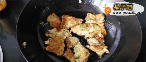 6煎至两面金黄,就可以关火了,用锅铲将鸡蛋饼划成小块,就可以出锅了