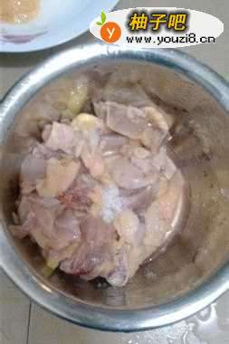 先把鸡肉切好,然后放少许盐腌半个小时这样子。