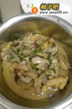 4然后把锅烧热,放油,放姜,再把鸡肉放下去炒一会儿,加盐,接着把香菇也放进去,加少许水。