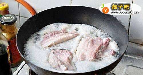 把五花肉洗净切成段,放进开水里焯一遍,把血沫撇除