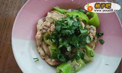 4半小时后下入青椒翻动一下,加入酱油、食盐、白糖调味。闷一分钟。装盘出锅,撒上香菜末。