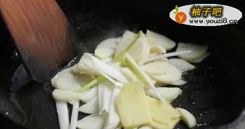 5锅中留底油,下姜片、蒜片、大葱煸出香味。