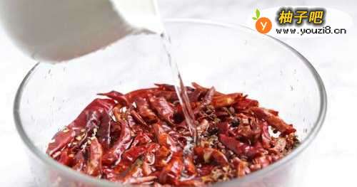3二荆条干红辣椒剪成小段,去籽。干红辣椒和花椒中加入清水浸泡五分钟,沥水待用。