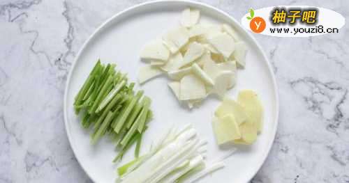 姜蒜去皮切片;大葱切细条待用;芹菜洗净去叶切成小段。