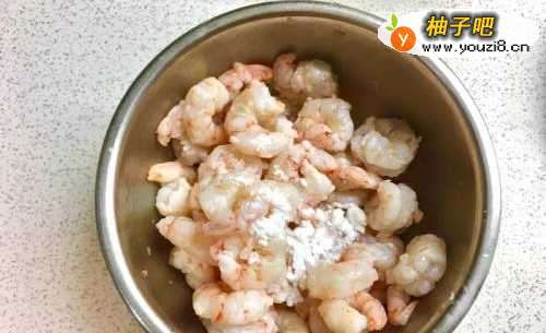 2虾仁放入太白粉、少许盐及少许白胡椒粉后拌匀备用