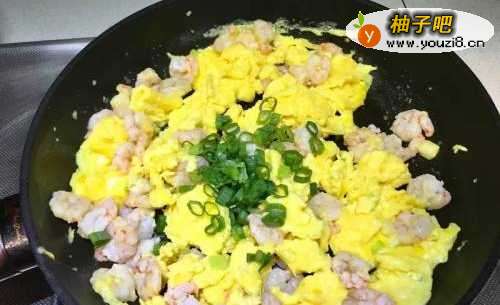 6加入虾仁迅速搅拌拌匀后加入葱绿
