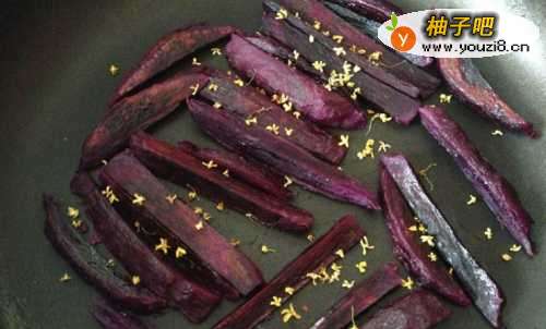 8轻轻翻炒紫薯干和桂花,3分钟后关火即可。最后撒上少量干桂花作为装饰。