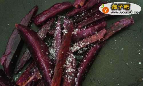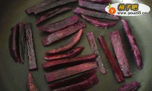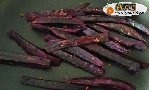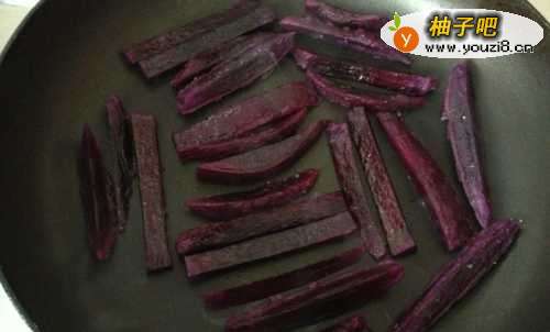 4平底锅用大火烤热后转小火,放上紫薯条,烘烤5分钟。