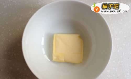 5取1/2黄油放在平底锅上,让紫薯条均匀地沾上黄油,继续烘烤5分钟。