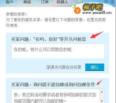 5这里面还可以自定义一些,比人你店铺里面是买书的,客人会问是不是正版的饿啊。什么这类的是不是清晰啊,你都可以设置一下,如果客人的话包含有这类的问句,就可以自动回答了。