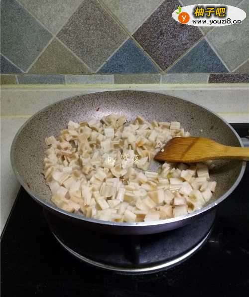 6放入藕丁翻炒;可调入适量清水,加盖焖一会;