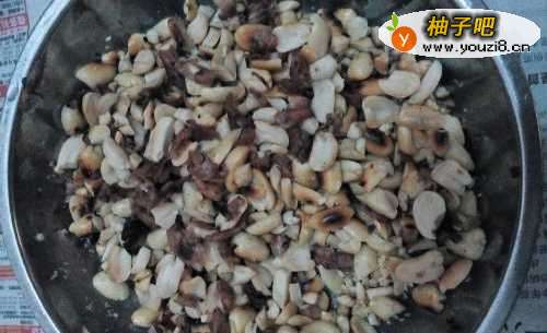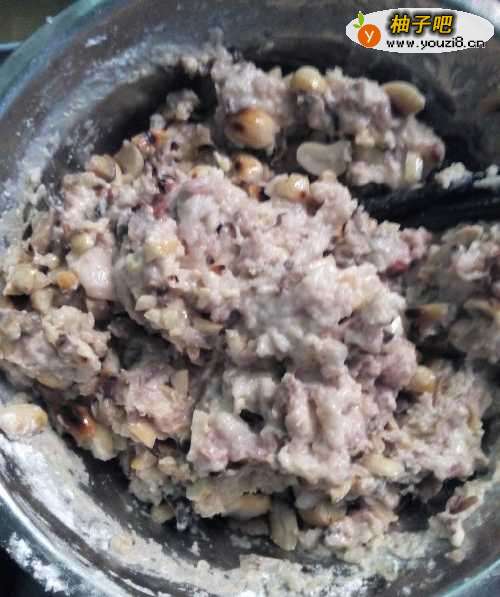 5再把炒好压碎的花生倒进装肉的盆子里,如图所示。