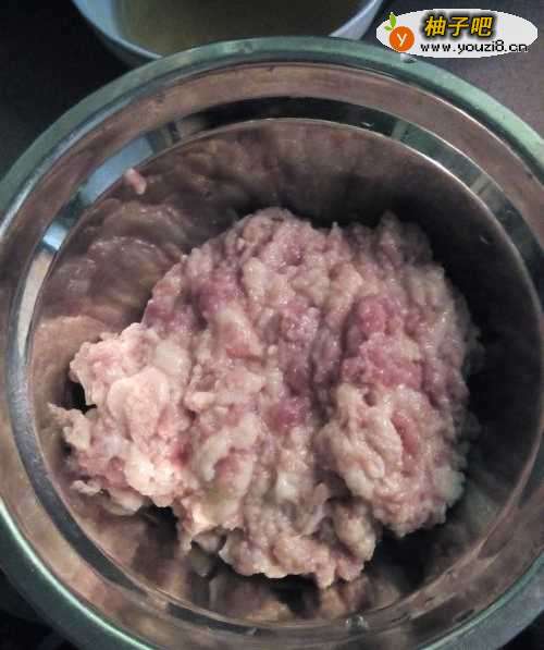3把半斤的五花肉(这个肉可以根据大家喜好选择也可以全瘦的肉)洗干净,先把肉切成一小块一小块(这样好剁一点,也可以用碎肉机把肉碎好),然后剁成肉沫,如图所示。