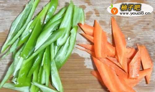 2青椒和胡萝卜切出形状备用。