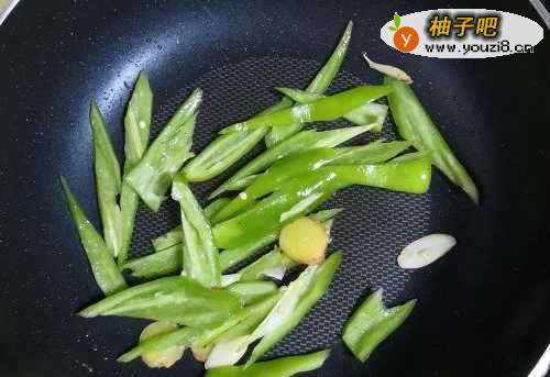 4锅中放姜蒜煸出香味,放入青椒翻炒。