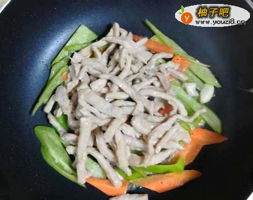 3锅中放油,油热后放入肉丝煸炒至发白,捞出备用。