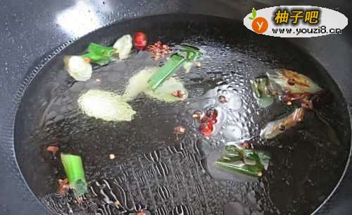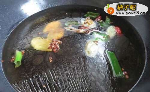 5锅中倒入油烧热后加入葱姜、花椒和干辣椒爆香