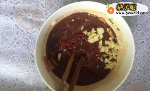 2将猪肝切片放入碗中,加入切好的泡红椒、仔姜片、剁碎的大蒜,少量料酒跟淀粉,腌制10分钟左右;