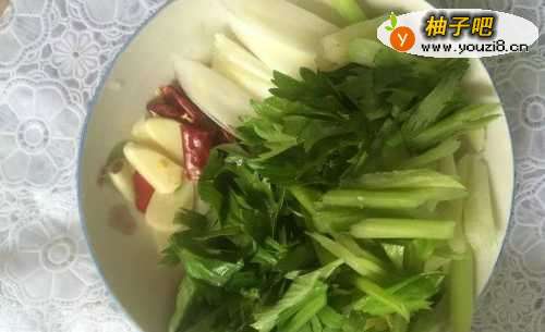 3将大蒜、生姜切片,辣椒切段(用手掰开也是可以的),大葱白斜切,芹菜切段备用;