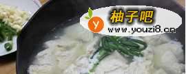 2锅中烧热水,放葱段,把豆腐放入煮10分钟,取出控水装盘备用