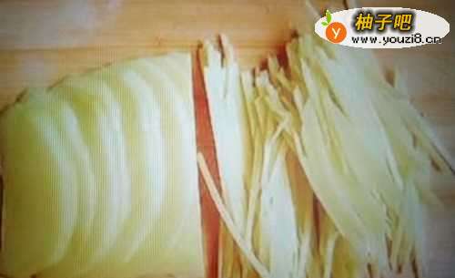 22、土豆切成片后,在切成丝,切的要领,土豆丝要大小一致,刀工不好的同学,就用专用擦土豆丝的工具,那个工具不仅能擦丝,还能擦片。