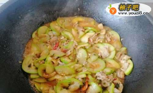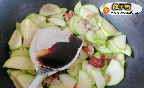 待猪肉炒至稍微变色后,倒入西葫芦煸炒。