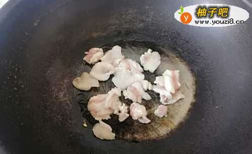 待肥猪肉的肥油煎出后,倒入小米椒、蒜末,大火爆香。