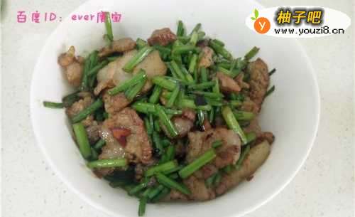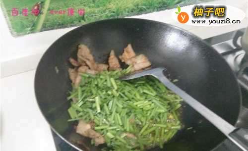 6待猪肉炼出猪油后,将韭菜花倒入锅内和肉一起炒勺,韭菜花容易熟而且会出水,因此这一步一定要保持大火且快速翻炒,直到韭菜花有明显的颜色变深时,可放入少量的酱油提色;