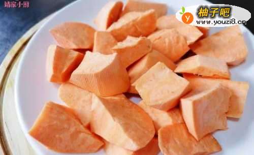 7取一个大平盘,先摆上红薯块,红薯切滚刀块,是为了在铺盘时留下自然的空隙,方便红薯在蒸制的过程中更容易熟透。