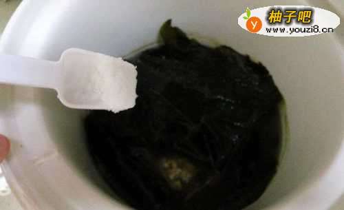 取大概20克海带干,在盆中用清水泡发洗净。泡起来会比干的多很多,所以只要一点点就可以了。