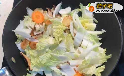 4接着加入白菜梗炒2分钟后加入一半香菇水焖煮1-2分钟