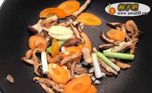 3先煮白菜锅底:热锅放油,依序放入虾米、香菇、红萝卜、蒜末、和葱白炒香