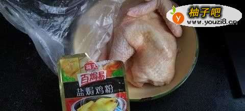 1鸡先用盐焗鸡粉全身按摩后,腌制一个小时
