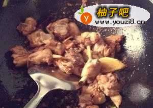 4将腌制好的鸡肉放入锅中,大火爆炒三分钟,翻炒至鸡块着色适度。加入老抽,料酒,八角,翻炒2分钟。
