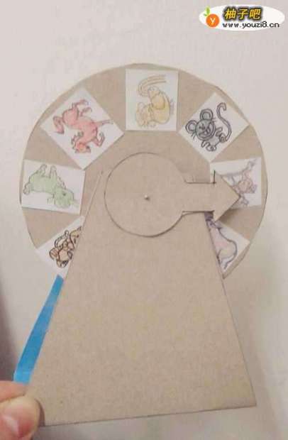 14把转盘立起来,也可以放在桌上,只要转动大圆转盘,转盘就能飞速地转起来,转盘停下时箭头所指的方向,就是转到的物品。转盘就做成了。