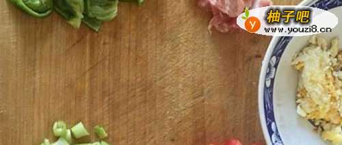首先准备好各种食材:把西红柿,青椒,葱都清洗干净,蒜提前准备好,再把青椒切成块状,把葱切片备用,把蒜拍碎。如下图所示。
