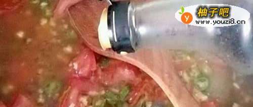5继续上面的步骤,继续放入切好的西红柿,翻炒,加入适量的花椒水,盐,五香粉等佐料,继续翻炒5-10分钟,如下图。