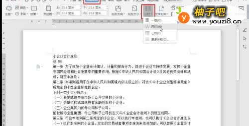 2选择文档内容,点击菜单栏的【页面布局】—【分栏】芬劫毙—【两栏】;