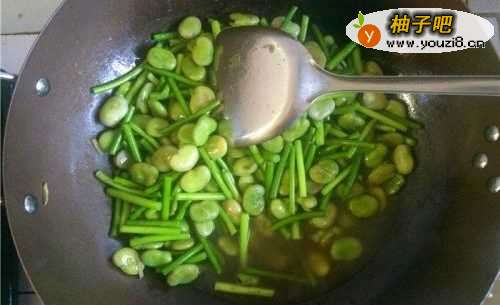 3然后放入准备好的蚕豆,不断的翻炒,直至蚕豆表面变得金黄为最佳。