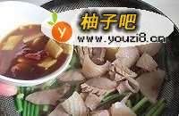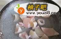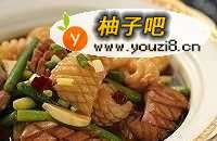 7蒜苗翻炒半熟时放入刚刚焯过水的鱿鱼和腰花翻炒;