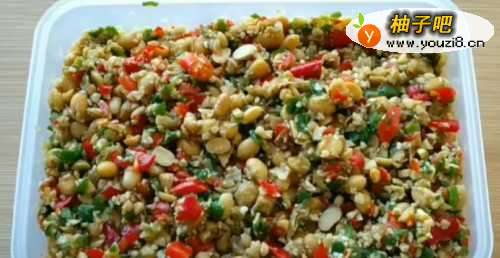 6把晾凉的黄豆倒入辣椒中搅拌均匀。装入无水无油的密闭容器中。腌制7天就可以吃了。见下图