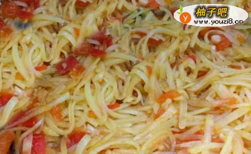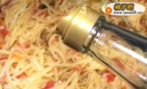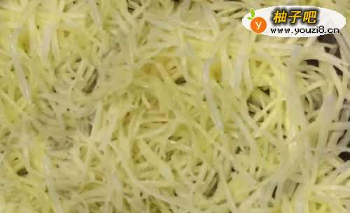 44. 放适量油加热,倒入土豆丝快速翻炒变软。土豆丝断生即可。注意不要炒的过久,以免影响口感。