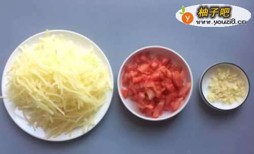 1.取出蒜头将皮剥干净,用刀剁蓉。土豆去皮后,用工具擦成丝。西红柿切成小块。