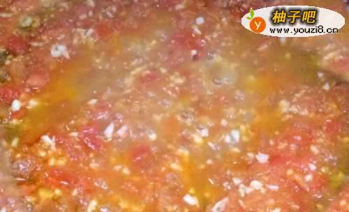 33. 锅中放少许油爆香蒜蓉。然后再放已经切好的西红柿翻炒。可加少许清水,将西红柿焖软烂。