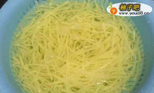 22. 将土豆丝反复清洗掉淀粉,浸泡半小时,也可以多延长一段时间,然后沥干水备用。