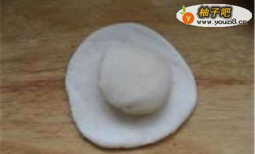 4取一份油皮擀成圆饼,放一个油酥在中间