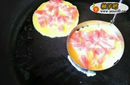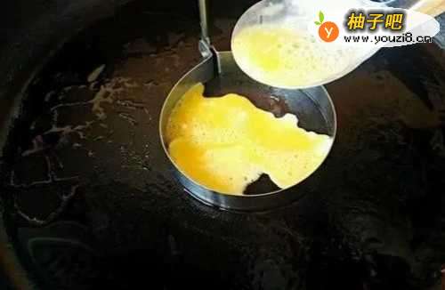 3平底锅刷一点油,取一个自己喜欢的模具,把鸡蛋液用勺舀2勺倒入模具里。