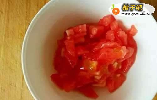 西红柿洗干净,用沸水烫一下扒皮,切丁。