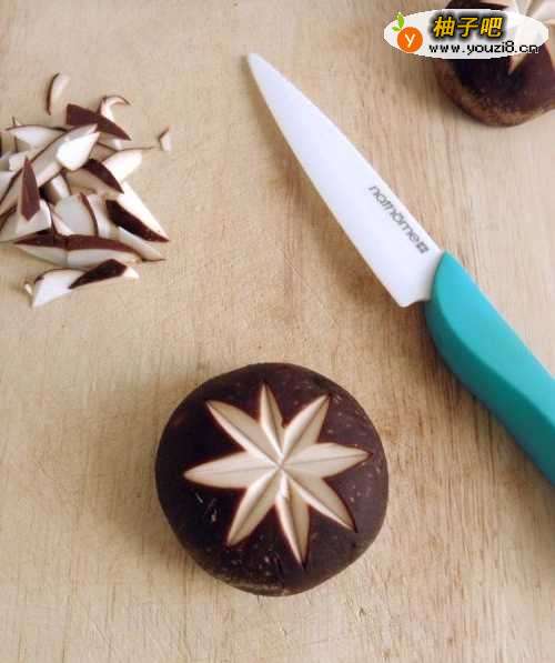 香菇洗净沥净水,用刀先将香菇蒂去掉,然后在香菇表面打花刀。打花刀的目的一个是菜品造型美观,一个是易于香菇的入味。切下来的香菇蒂和碎块,可以用来炒饭或者炒青菜。