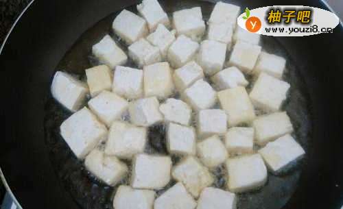 4:把豆腐块煎至金黄后盛出备用。